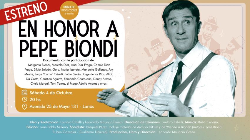 Este sábado 4 de octubre, se cumplen los 50 años del fallecimiento del popular capo cómico. Hecho ocurrido el 4 de octubre de 1975. El merecido homenaje a Biondi consiste en el estreno del documental “En honor a Pepe Biondi”, originado en el libro escrito por Leonardo Greco “Pepe Biondi, el campeón del humor”. El evento se realiza este sábado 4 de octubre en Cultura Lanús, a partir de las 20 horas, en avenida 25 de Mayo 131, Lanús Oeste.