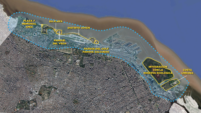 Siempre Buenos Aires estuvo conectado con su río. Ha llegado el tiempo de recuperarlo. Este proyecto puede ser el hilo conductor en ese sentido. El plan incluye el desarrollo de una serie de proyectos urbanísticos entre los que se destacan: Plaza y Memorial AMIA para conmemorar las víctimas del atentado. Parque del Vega: nuevo espacio verde de 5 ha. BA Playa: una playa pública para 6 mil personas. Parque del Golf – Parque Salguero: un nuevo parque público de 8.8 ha. Distrito Joven: 73 ha con 65% de espacio público y verde. Integración con la Reserva Ecológica y Costa Urbana: un predio en desuso se transformará en un nuevo espacio verde de 58 hectáreas.