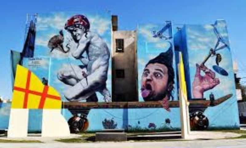 Desde este lugar, al Gobierno de la Ciudad se generó la idea de esta obra. Que es de una dimensión gigantesca, con una superficie de 412 metros cuadrados. Lleva como nombre distintivo “El cuento de los loros”, inspirado en los pájaros que abundan en la zona, una cara enorme en el medio de la obra se refiere a un amigo del autor. Aparece una mano tomando un chupetín de abeja.